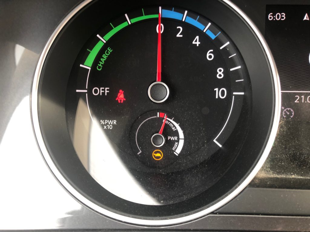Samochód ma 24 kWh czyli tyle co stary LEAF. Początkowo auto pokazywało, że przejedzie 180 km . Drogę zaplanowaliśmy tak, aby dojechać do domu na rezerwie. Przejechaliśmy 155 km i zostało nam jeszcze 6 km – czyli 161 km. Przy czym przez większość drogi jechaliśmy normalnie 60-70 km – nie oszczędzaliśmy auta specjalnie. Pogoda była bardzo sprzyjająca, ponieważ było 20 stopni. Klimatyzacja włączona automatycznie. Samochód zaczął alarmować o niskim stanie baterii przy zasięgu 20 km. Po czym zaczął zmniejszać moc. Przyspieszenie było coraz wolniejsze, ale nadal można było się rozpędzić do 60-70 km . Moc jest ograniczana kiedy strzałka wejdzie na czerwony obszar , wtedy też zapala się żółw charakterystyczny w samochodach elektrycznych (patrz zdjęcia poniżej).